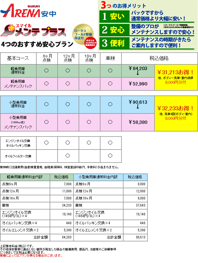 愛車のメンテナンスをサポート 愛車に必要なメンテナンスをお得パックで設定 メンテナンスパック \38,370 定期的に点検される方におすすめ!お得にメンテナンス! ☆軽自動車 52,990円 ☆軽貨物車 55,850円 ☆小型乗用車(1500cc未満)58,380円 ☆中型乗用車(2000cc未満)65,090円 ☆普通乗用車(2000cc越え)70,260円 ※途中加入もできます(38,370円~))